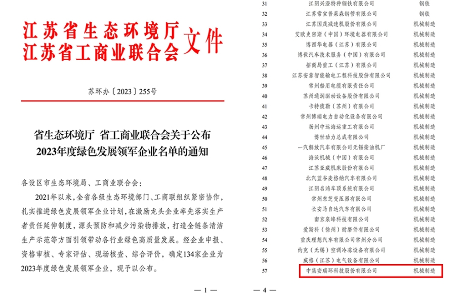近期,江蘇省生態(tài)環(huán)境廳與江蘇省工商業(yè)聯(lián)合會聯(lián)合發(fā)布“2023年度綠色發(fā)展領(lǐng)軍企業(yè)”名單,中集安瑞環(huán)科技股份有限公司上榜。